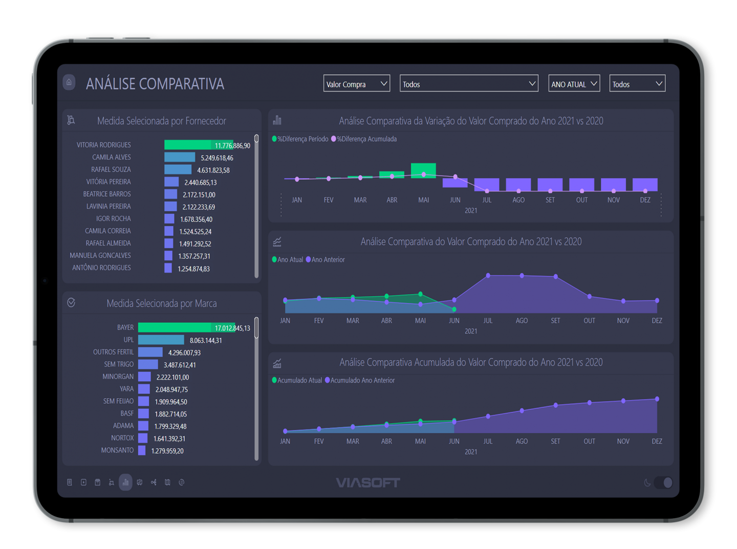 - Análise comparativa da variação da quantidade comprada no ano atual vs. anterior (valor e quantidade);