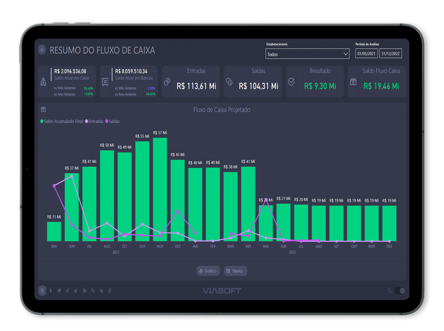 Fluxo de caixa projetado (saldo acumulado final, entradas e saídas).