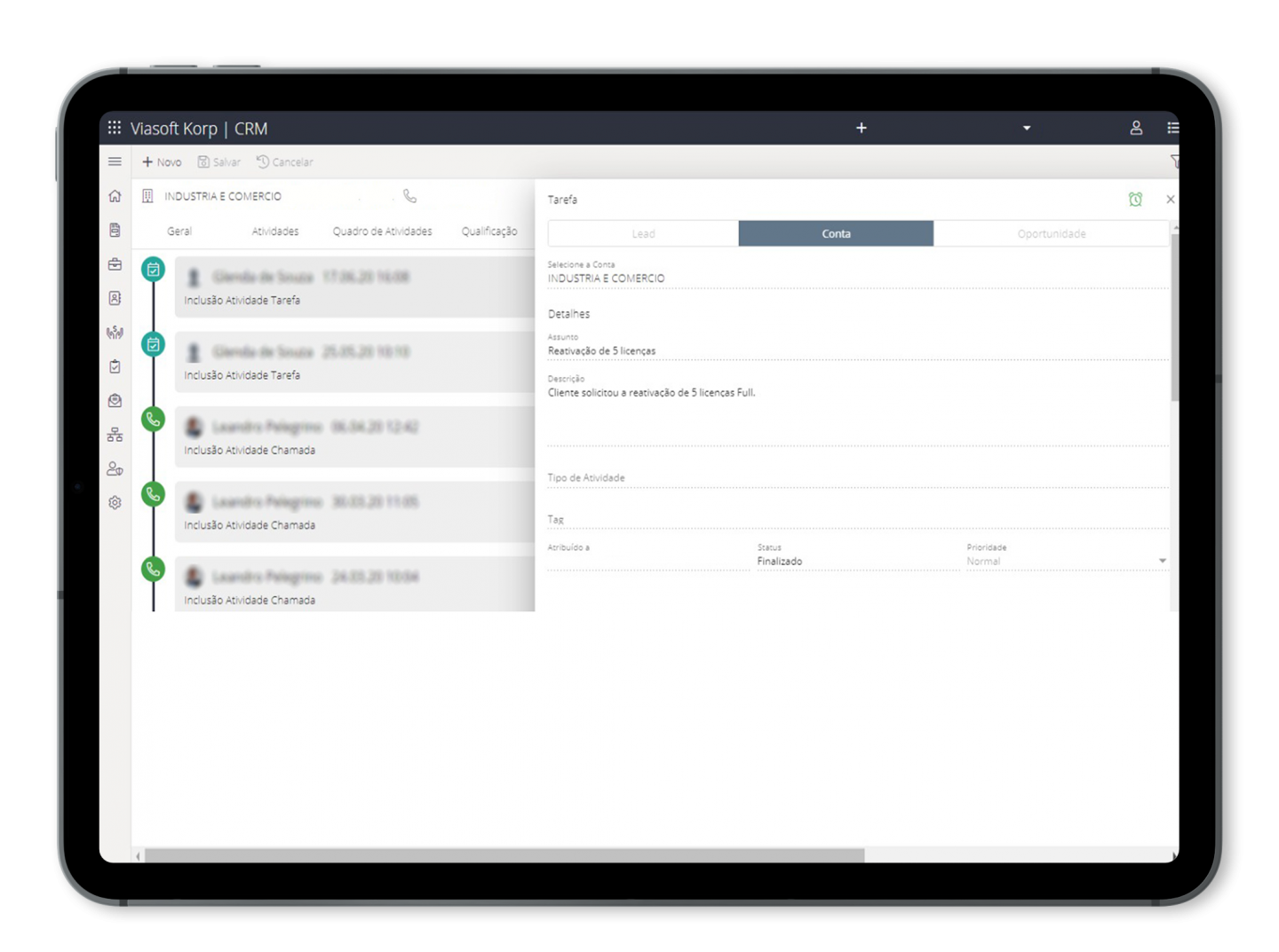 Registre a atuação de toda equipe com esse consumidor, desde quando era um prospect. Saiba as satisfações ou insatisfações no relacionamento com a empresa. Entenda também o momento certo de atuar para conquistá-lo e fidelizá-lo. No histórico podem ser demonstradas atividades identificadas por: tipo. Exemplos: elogio, reclamação, solicitação, ou outro, pois o “tipo” é parametrizável.